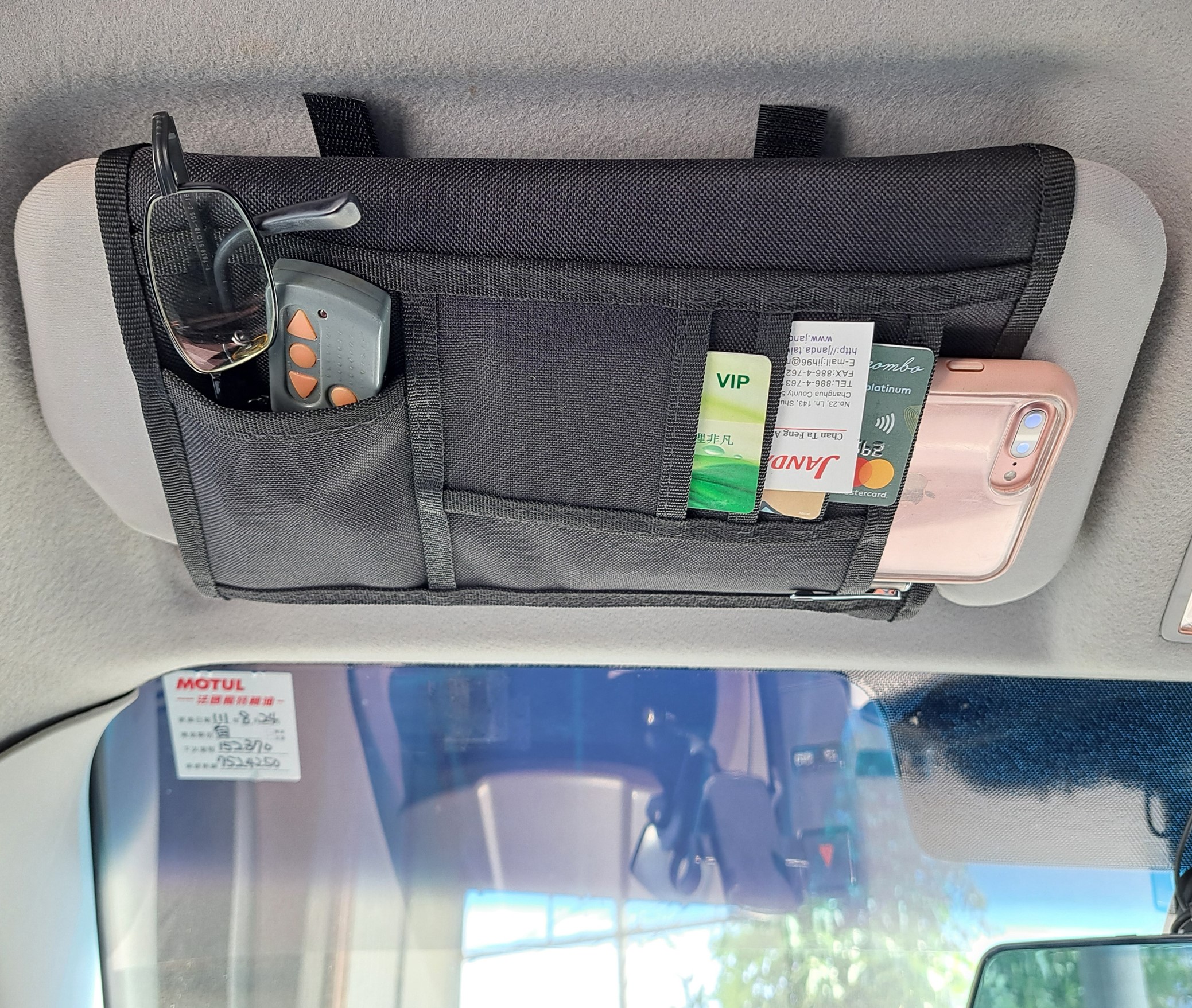 wrap the band around the sun visor or use Velcro tape to secure the organizer. This design is perfect for keeping important items organized and easily accessible while driving.