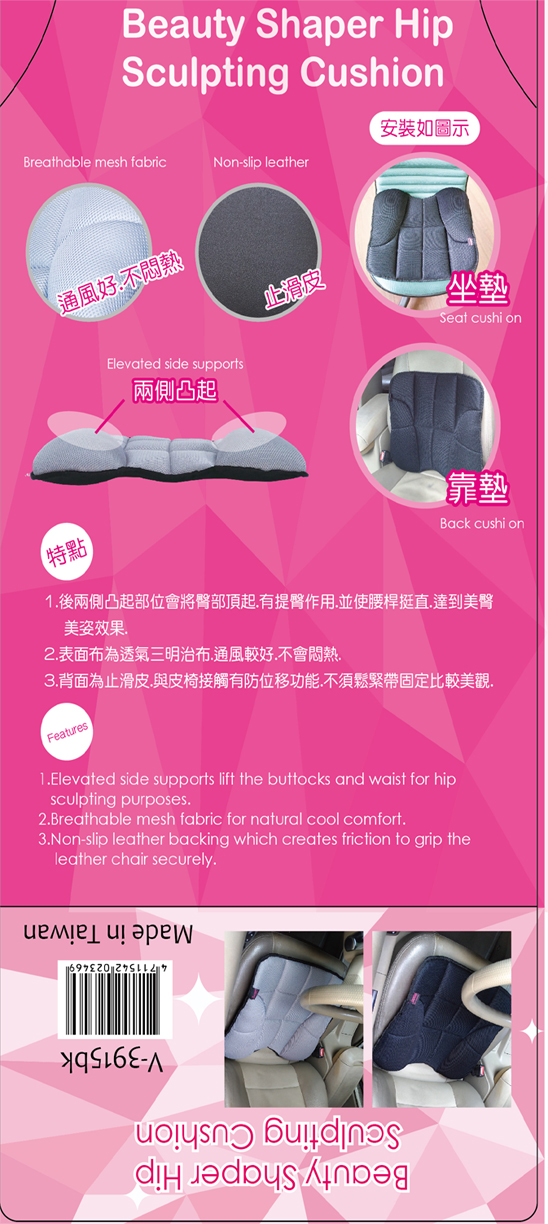 Model ID:V-3915The Beauty Shaper Hip Sculpting Cushion is designed specifically for the hips, with side supports that lift waist and sculpt the hips to provide maximum comfort during long car rides. This product is manufactured by Made in Taiwan (MIT) using breathable mesh fabric, which offers a cool and comfortable seating experience. Additionally, the anti-slip leather bottom creates friction to grip onto leather seats securely. The cushion's design is both easy to carry and suitable for use in all types of vehicles.