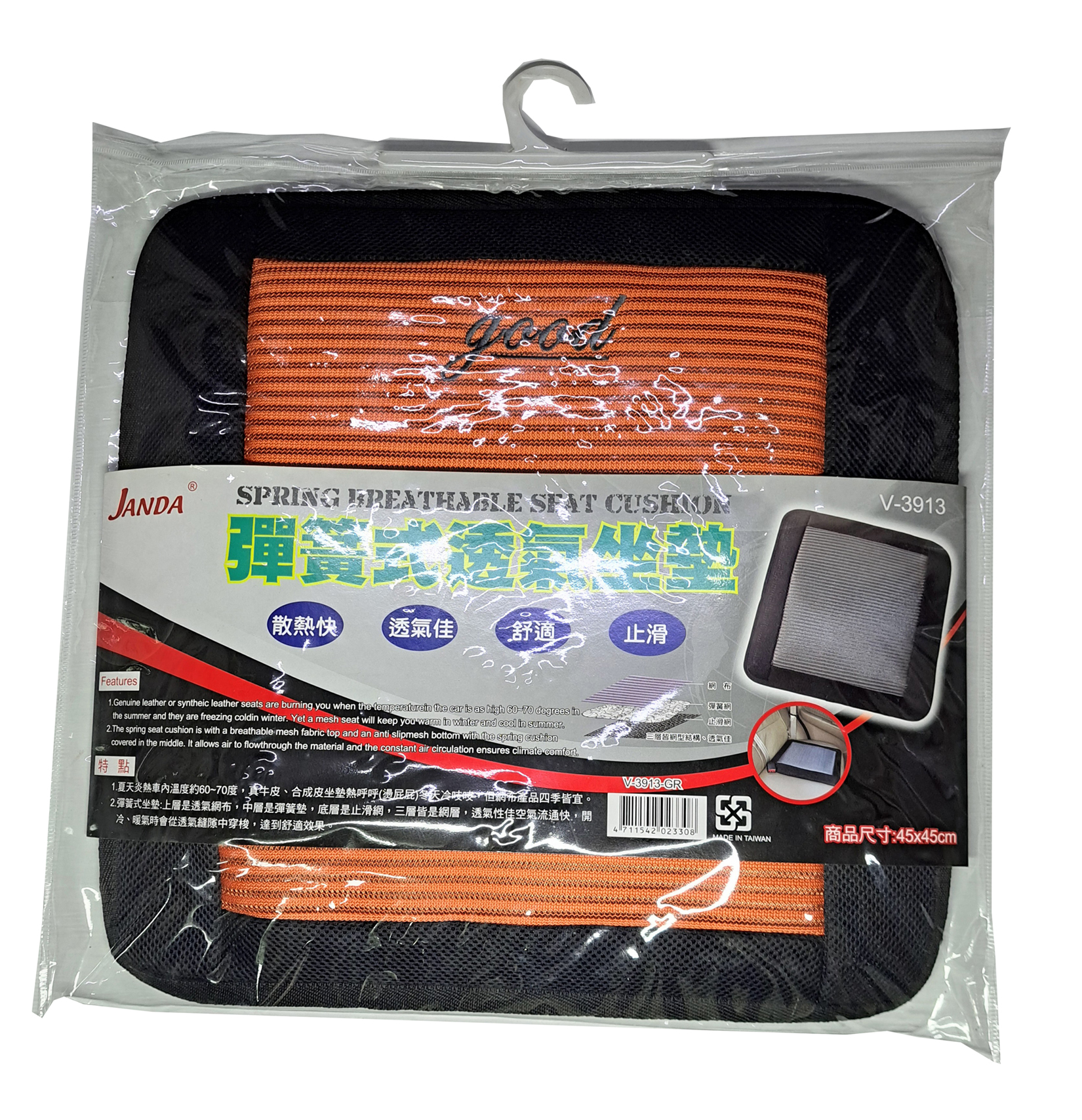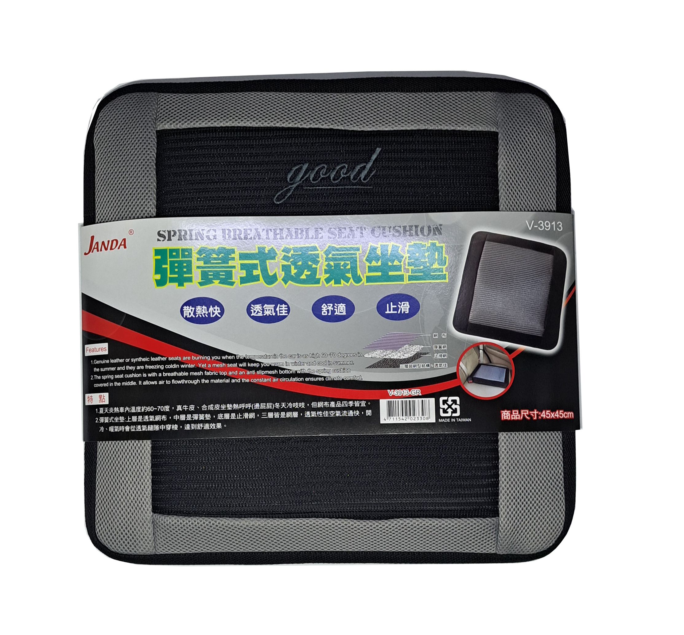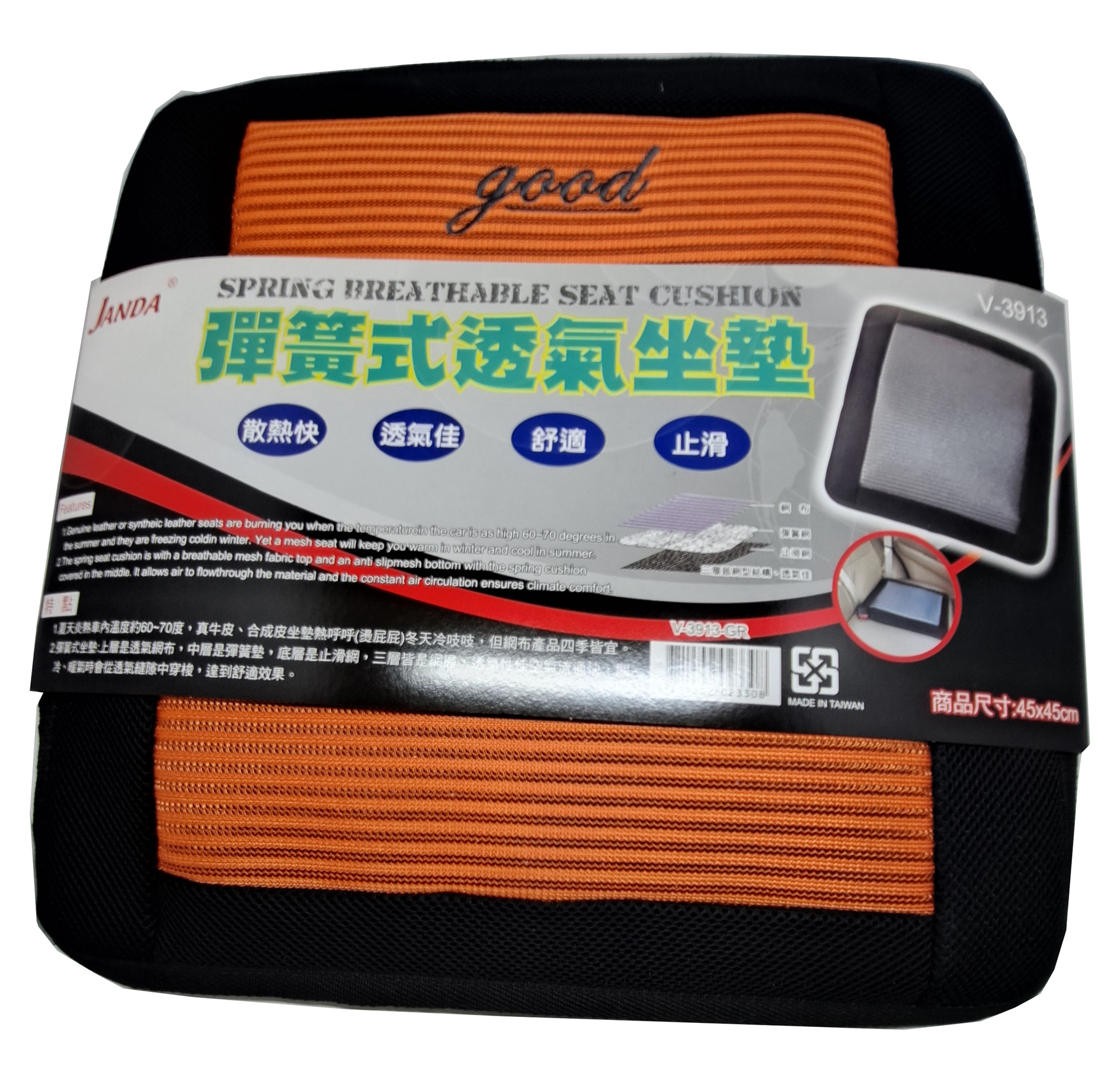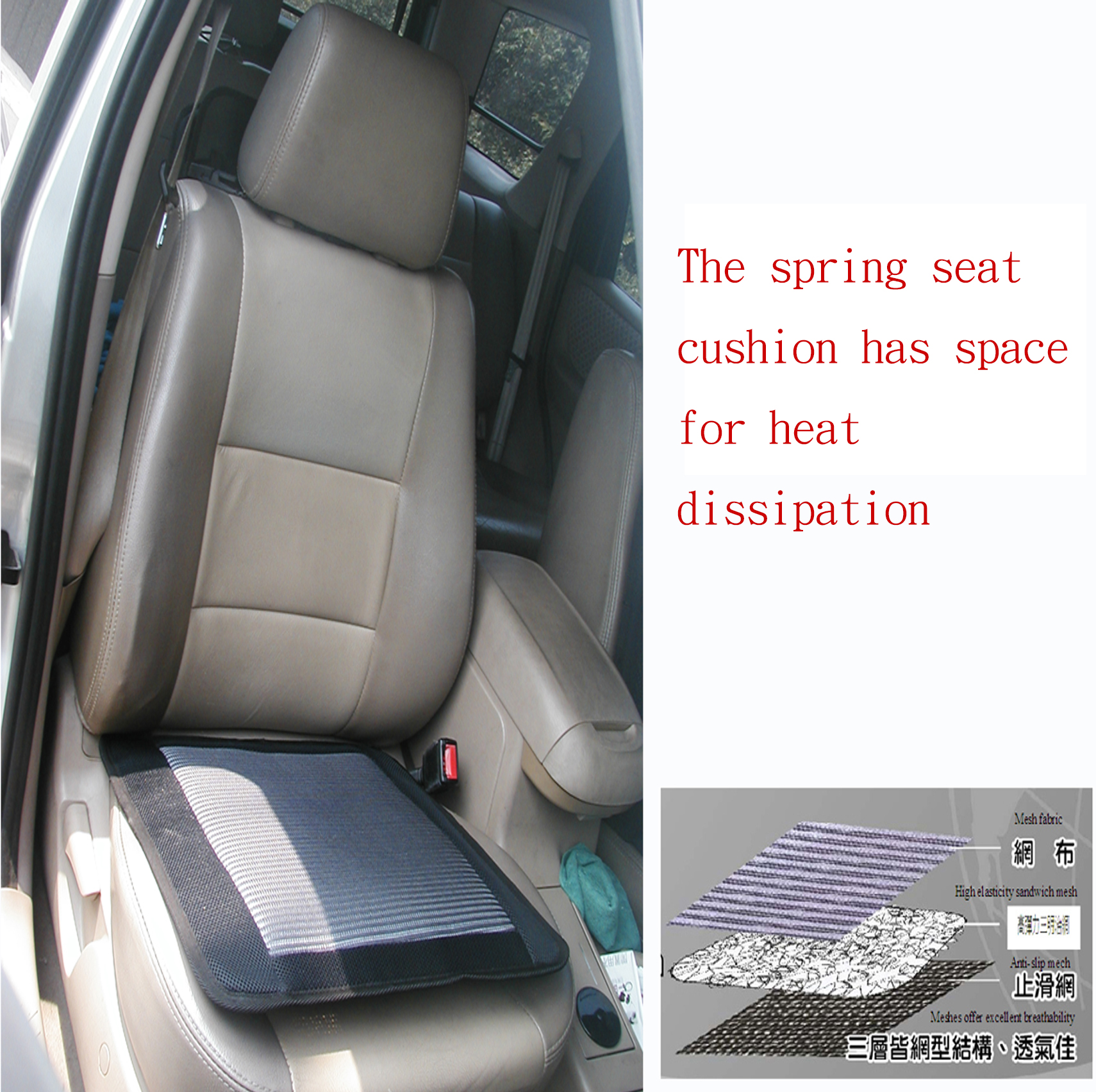 2.彈簧式座墊:上層是透氣網布.中層是彈簧墊.底層是止滑網.三層皆是網層.透氣性佳.空氣流通快.開冷.暖氣時會從透氣縫中穿梭.達到舒適效果.