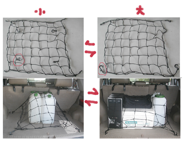 (2) The two hooks under the net, catching on the place where we can fix or the original car has hooks, entangle with the elastic.