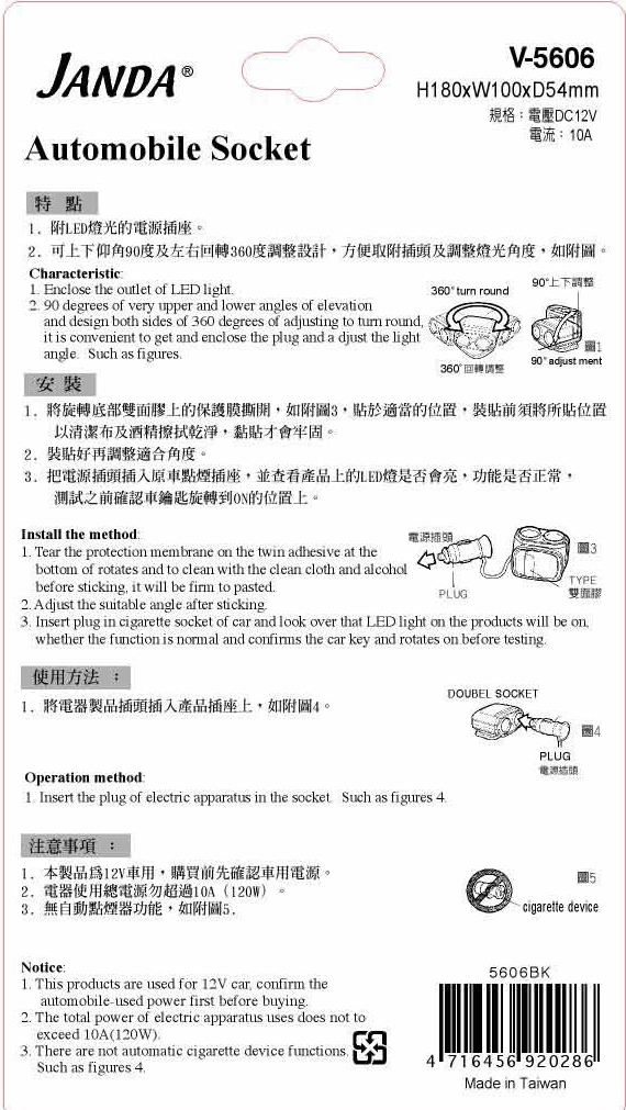 型號 ID:V-5606車用插座產品特性: