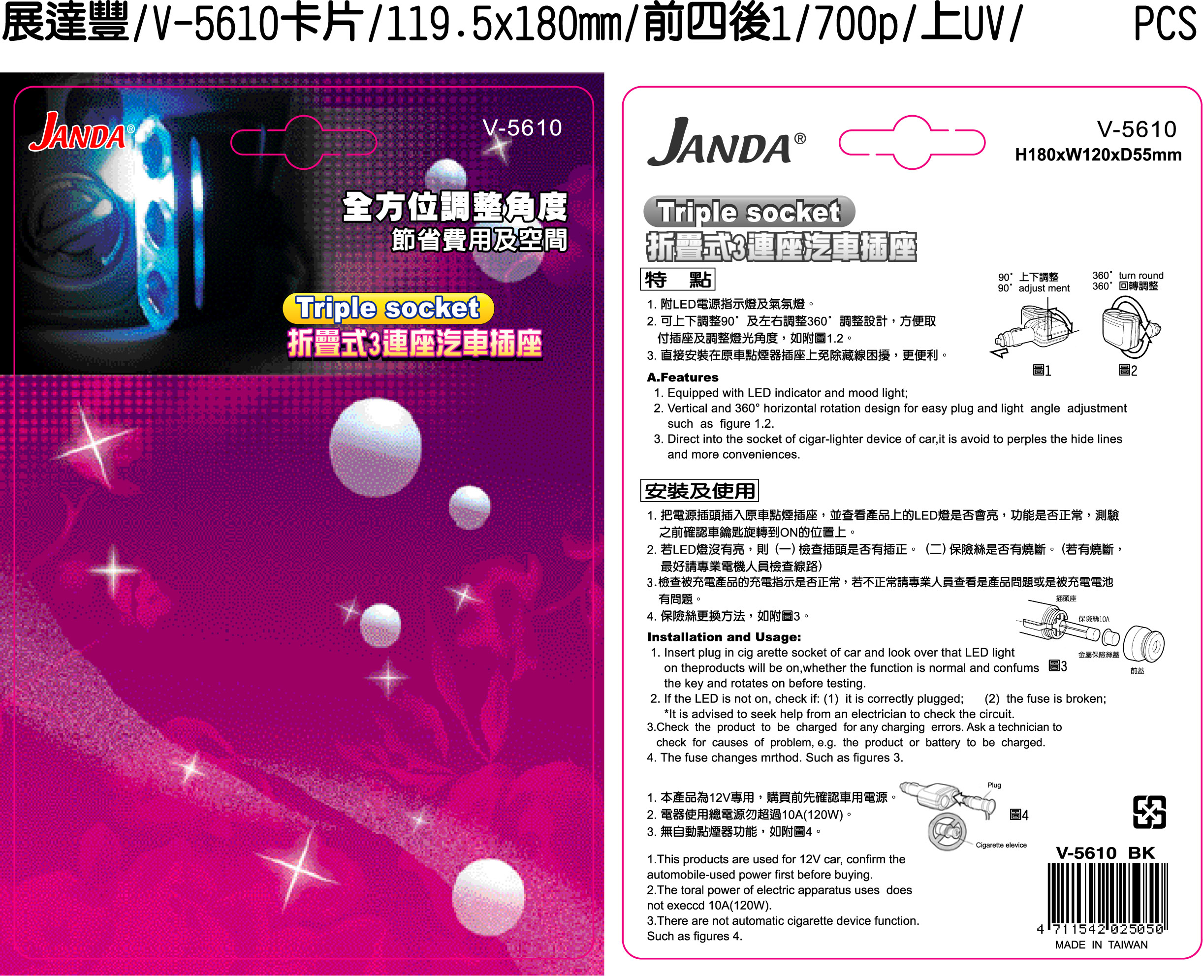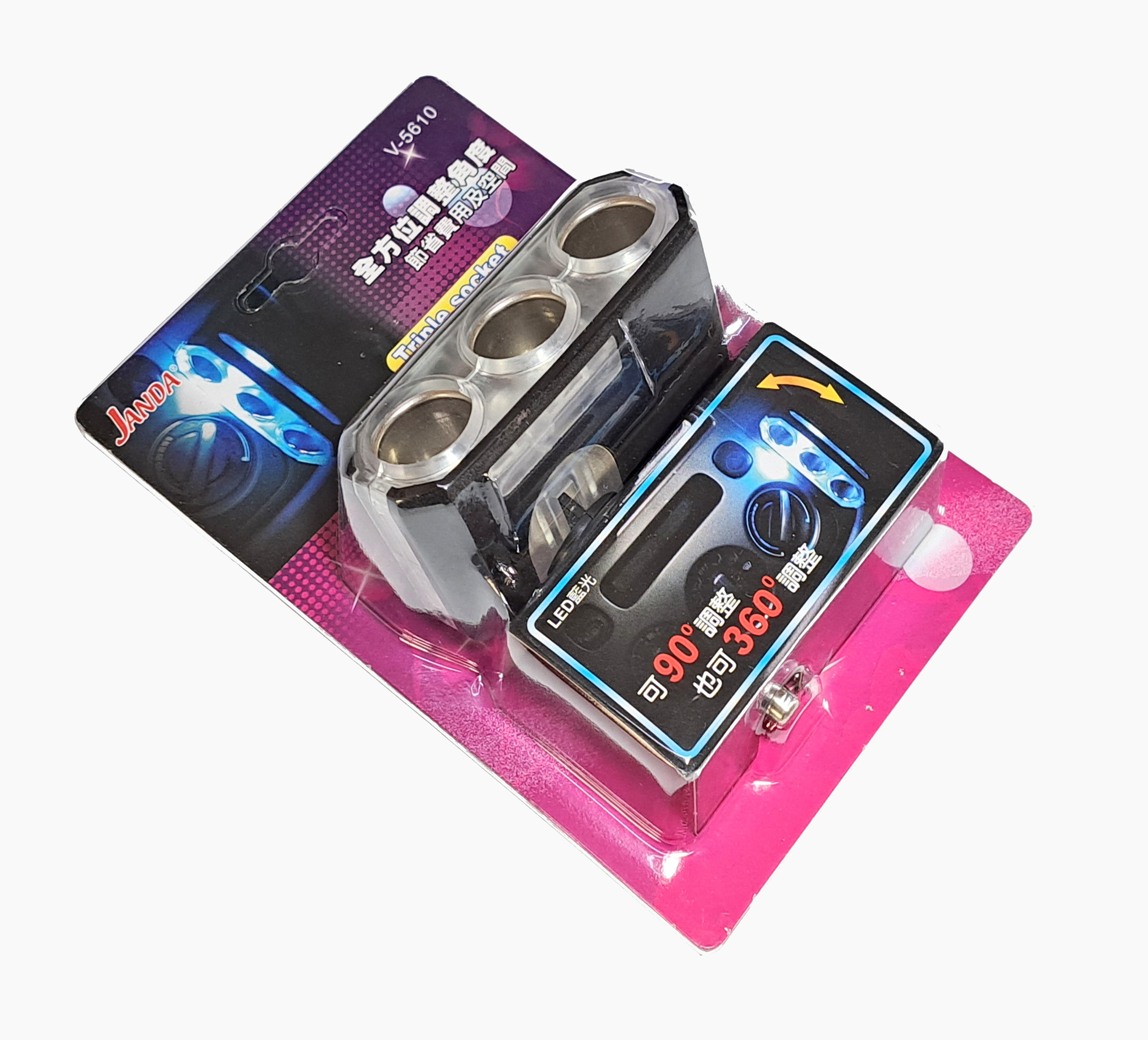 具備上下90度仰俯角及兩側360度旋轉調整設計,方便插拔插頭及調整燈光角度,如圖所示。