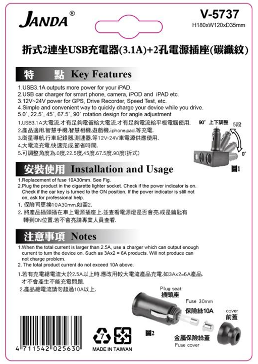 Model ID:V-5737Car cigarette lighters usually only have one socket, which may not be enough when you want to use devices such as satellite navigation systems, dash cams, speedometers, etc. to help you gather more road information during your journey, but there are no available sockets. Janda has designed a two-hole folding cigarette lighter extension socket that allows you to plug and use anytime, meeting your needs quickly and conveniently without the need for permanent installation. This product can be fixed and adjusted to the appropriate angle, allowing you to easily install car electronic accessories. In addition, this product can be used for in-car charging and is compatible with vehicles with input voltages ranging from 12V to 24V. It also features power indicator lights for quick and clear visibility of its usage status.