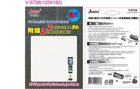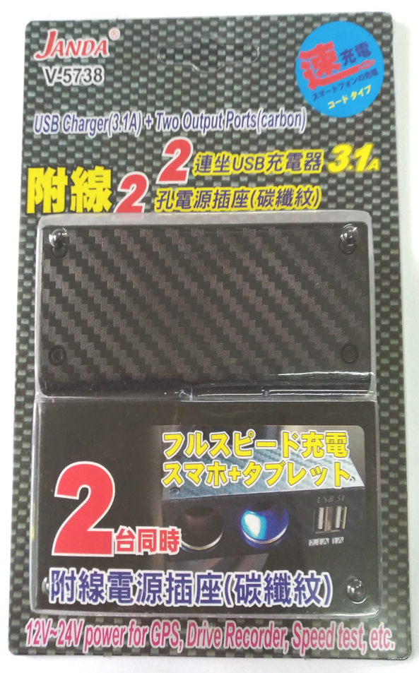 Model ID:V-5738V-5738 USB Charger(3A) + Two Output Ports + Cable(carbon) Key Features: 1. USB3A outputs more power for your iPAD. 2. USB car charger for smart phone, camera, iPOD and iPAD etc. 3. 12V~24V power for GPS, Drive Recorder, Speed Test, etc.