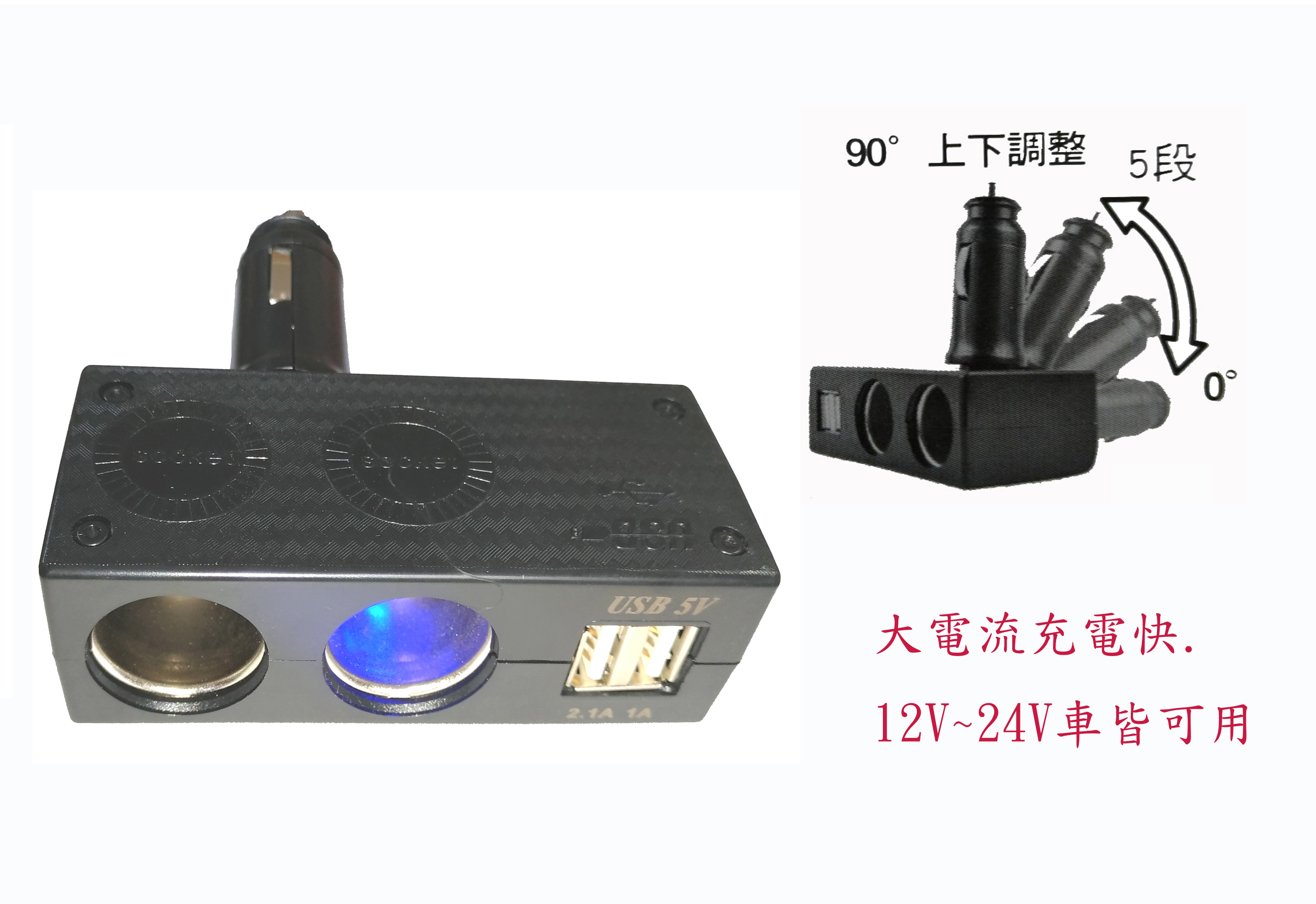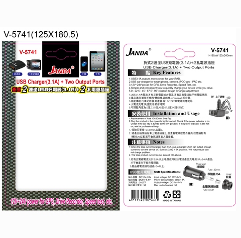 Model ID:V-5741Key Features: 1. USB3A outputs more power for your iPAD. 2. USB car charger for smart phone, camera, iPOD and iPAD etc. 3. 12V~24V power for GPS, Drive Recorder, Speed Test, etc. 4. Simple and convenient way to quickly charge your device while you drive. 5. 0˚, 22.5o, 45o, 67.5o, 90o rotation design for angle adjustment Installation and Usage: 1. Replacement of fuse 10A30mm. See Fig. 2. Plug the product in the cigarette lighter socket. Check if the power indicator is on. Check if the car key is turned to the ON position. If the power indicator is still not on, ask for professional help. Notes 1. When the total current is larger than 2.5A, use a charger which can output enough current to turn the device on. Such as 3Ax2 = 6A products. Will not produce can not charge problem. 2. The total product current do not exceed 10A above.