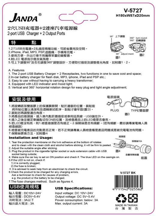 型號 ID:V-5727輕鬆擴充您的車輛功能!我們的車用擴充器設計小巧輕便,方便攜帶且易於安裝使用。它為您的愛車提供多種實用功能,包括USB充電及點煙器擴展插座。無論是長途旅行還是日常通勤,您都能隨時為手機、平板、衛星導航、行車記錄器、測速器等設備充電,不受充電設施限制,讓旅程更加愉快!